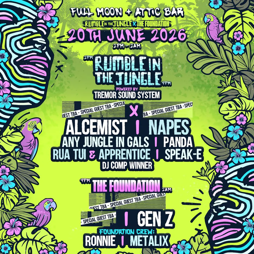20/06/2026Rumble in the Jungle are back with The Foundation for an all day and night yard party at The Full Moon with Alcemist, Napes, Special Guests & More! Start: 20/06/2026 14:00:00 End: 21/06/2026 02:00:00 Doors Open: 14:00 Doors Close: 02:00 (Last Entry: 01:30) Genres: UK Garage, Drum and Bass, Jungle