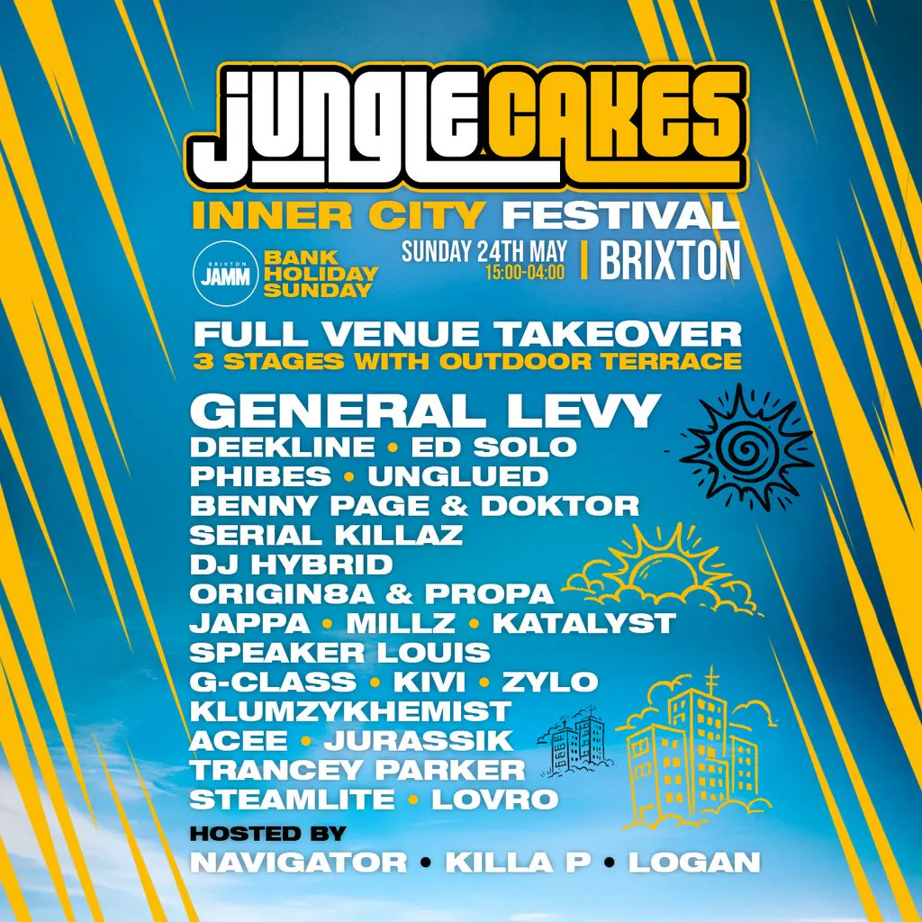 Jungle Cakes takes over Brixton Jamm for a 3 stage inner city festival on Bank Holiday Sunday! Start: 24/05/2026 15:00:00 End: 25/05/2026 04:00:00 Doors Open: 15:00 Doors Close: 04:00 (Last Entry: 03:00) Genres: Drum and Bass, Jungle Artists: General Levy, Deekline, Ed Solo, Benny Page, Phibes, Serial Killaz, Killa P, Navigator, Unglued, Doktor, DJ Hybrid, JAPPA, Origin8a & Propa, DJ Millz