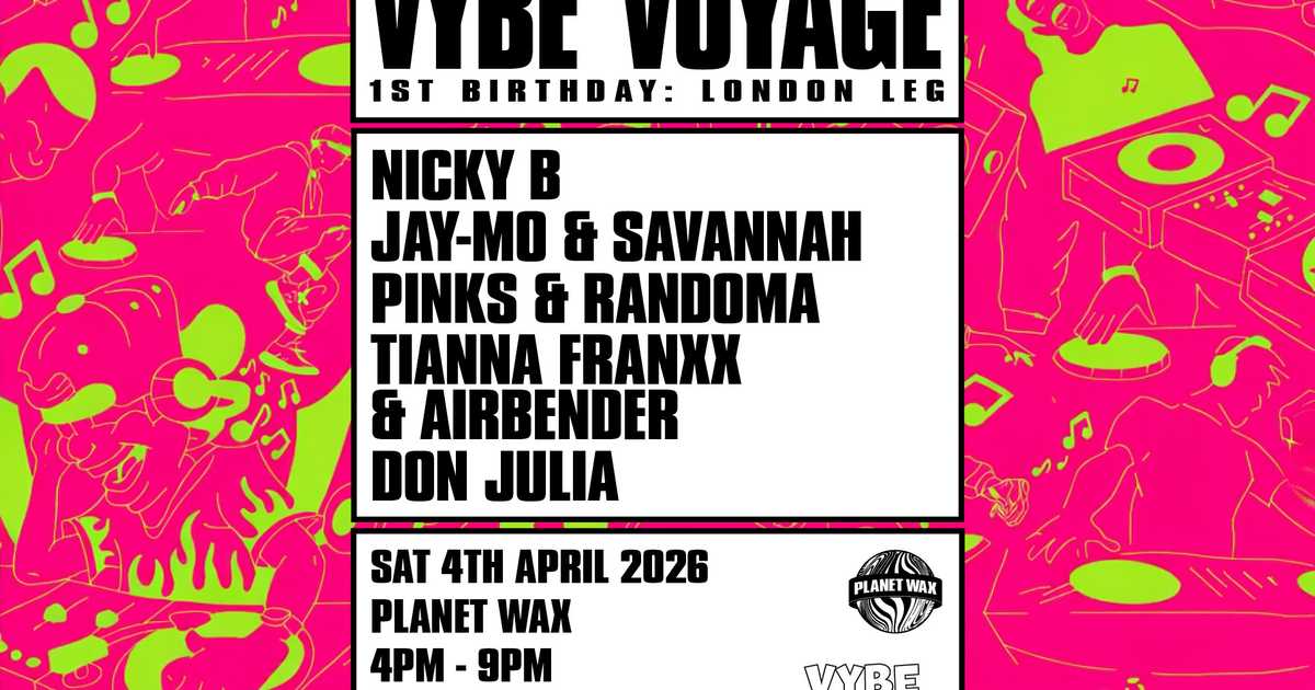 Vybe Voyage storms back to Planet Wax for the London leg of their genre odyssey — one year deep and still pushing full-throttle, bass-hea... Start: 04/04/2026 16:00:00 End: 04/04/2026 21:00:00 Doors Open: Doors Close: (Last Entry: ) Genres: Drum & Bass, Garage Artists: DJ Nicky B, JAY-MO, SAVANNAH, Randoma, Tianna Franxx, SEC (1), Coen